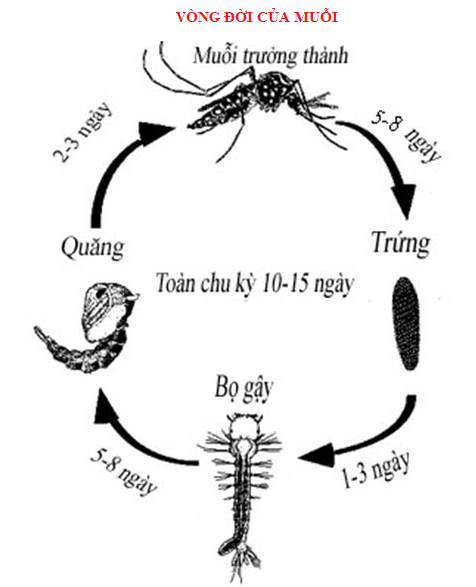 Muỗi sinh trưởng và phát triển ở nơi ẩm ướt, tù đọng nước với nhiệt độ 200C – 250C. Vòng đời của muỗi gồm 5 giai đoạn: Muỗi -> Trứng -> Bọ gậy -> Nhộng -> Trưởng thành
